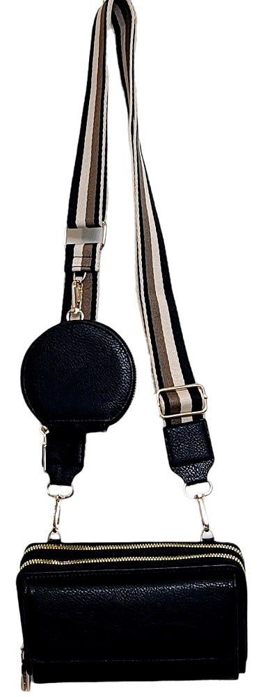 This cute crossbody bag boasts an adjustable strap with red, white, and beige stripes. It includes a main zippered compartment and a small round pouch attached to the strap for added convenience and style. Perfect for daily use!