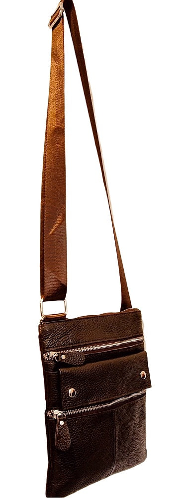 This elegant brown leather crossbody bag features a sleek, adjustable strap for comfort and convenience. It has two spacious main zippered compartments and two smaller silver-buttoned pockets, ideal for organization. Its timeless design and practicality make it perfect for both casual and professional settings.