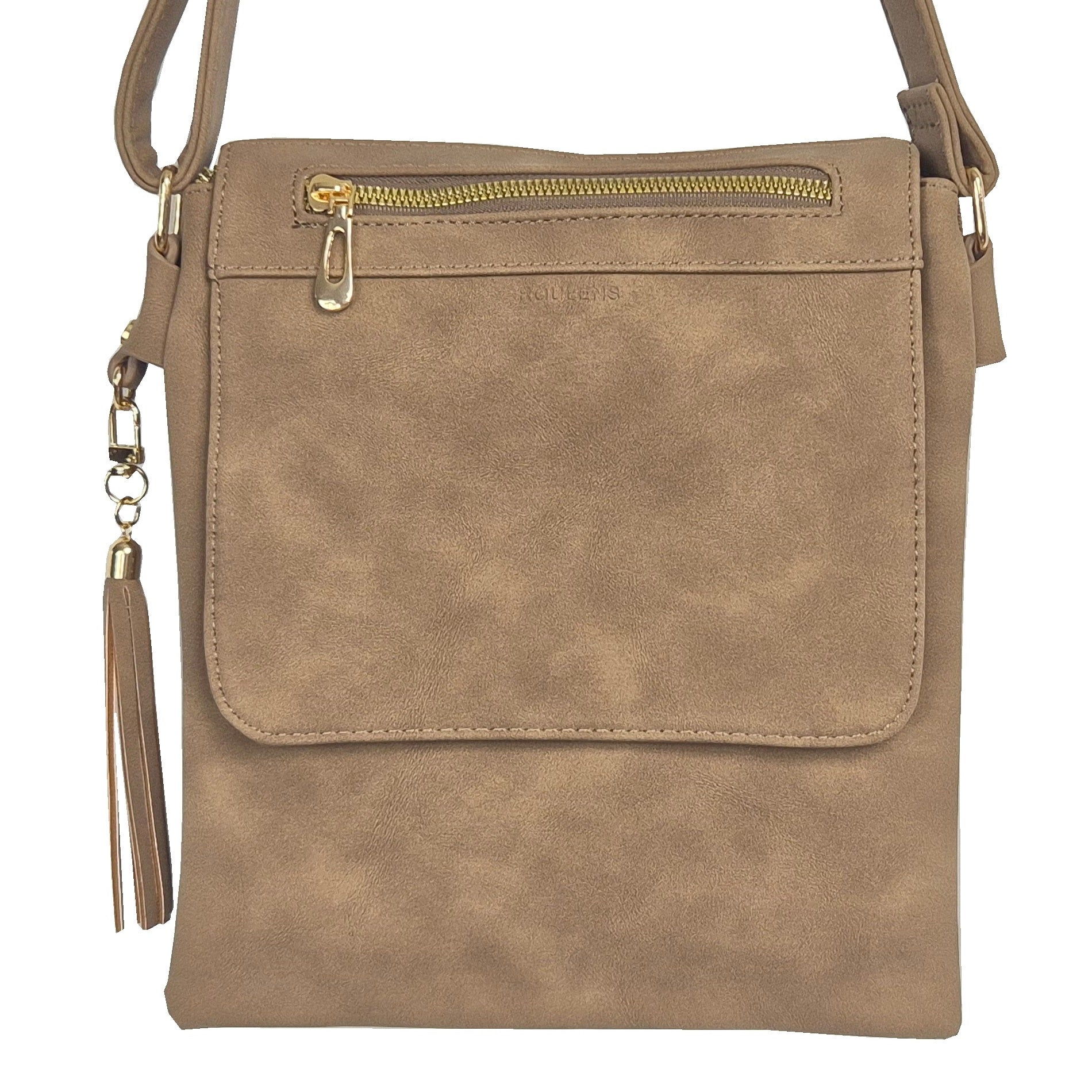 This elegant suedette crossbody bag features a soft grey finish with a front zip pocket and a flap embossed with “ROULENS.” The zip-around closure and gold-tone hardware offer secure functionality, while a tassel charm adds flair. Its adjustable strap ensures comfortable wear, and the compact design balances everyday practicality with refined style. Perfect for casual outings or city strolls, it delivers versatility and understated charm in one graceful package.